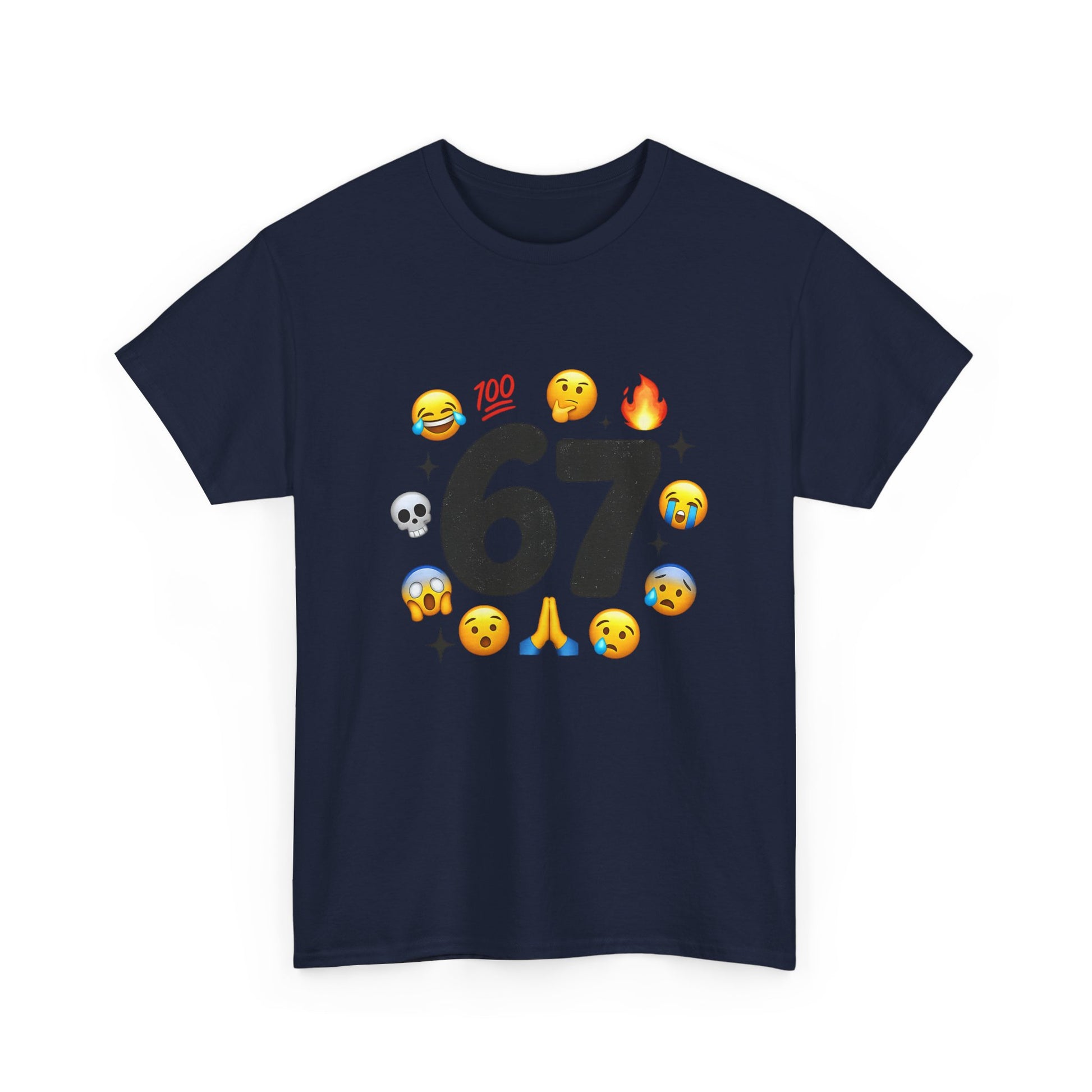 This tee is a cheeky, nostalgic wink for anyone who grew up chasing inside jokes and reaction faces online. Lightweight but sturdy, it carries that goofy "67" emoji motif like a badge of late-night chatroom glory — the kind you pull on for a low-key hangout, a gaming stream, or a retro meme night. Short, confident sentences: it’s soft against the skin, holds its shape after washes, and prints crisp so the emoji stays bold and readable. Wear it to spark a laugh, start a conversation, or lean into a shared digital memory with friends. The relaxed crew neck and classic fit make it easy to layer under a hoodie or wear on its own when you want to keep the mood casual and a little ridiculous.